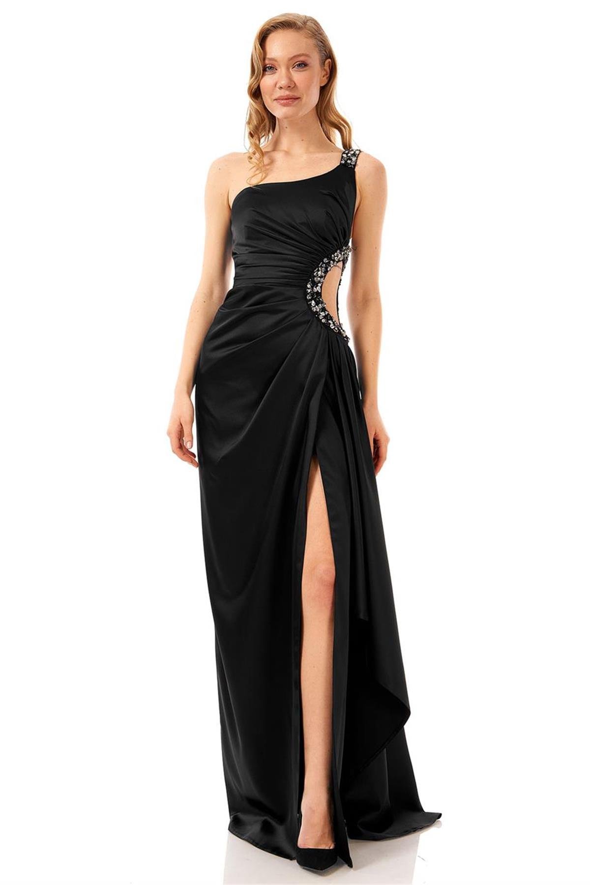 Tek Taşlı Askılı Beli Dekolteli Yandan Yırtmaçlı Uzun Abiye Elbise