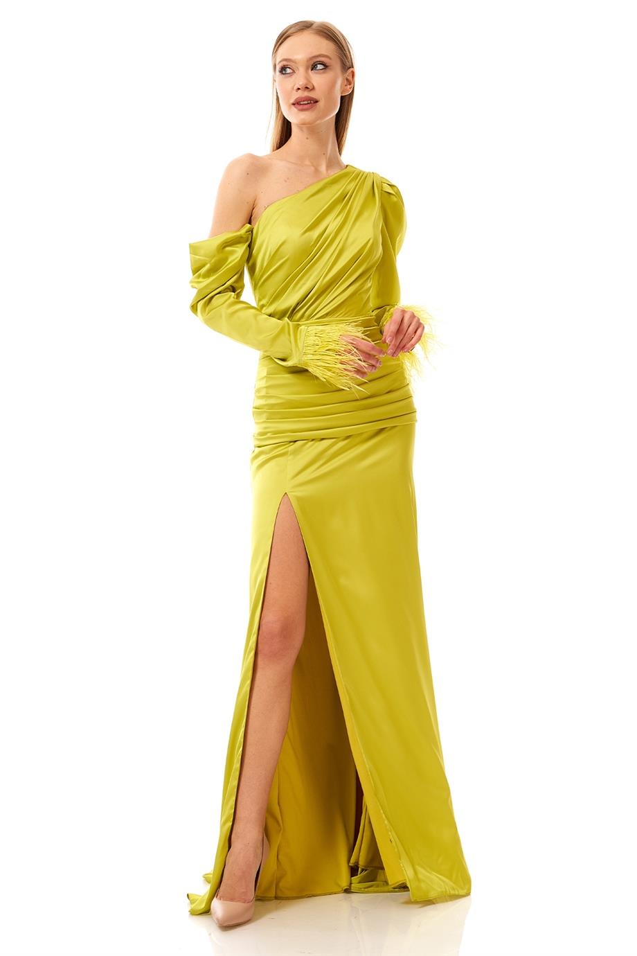 Tüllü Uzun Kol Tek Omuz Yırtmaçlı Saten Abiye Elbise