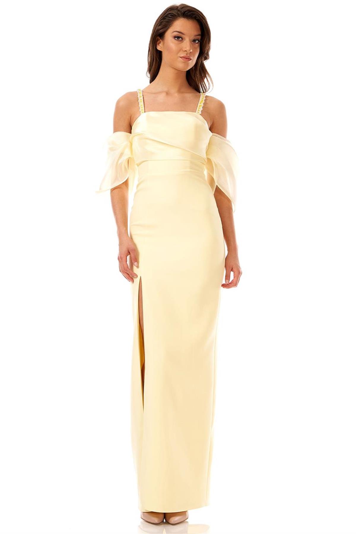 Askılı Düşük Balon Kol Yırtmaçlı Uzun Abiye Elbise