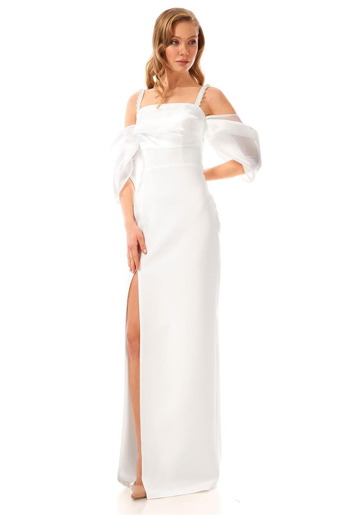 Askılı Düşük Balon Kol Yırtmaçlı Uzun Abiye Elbise