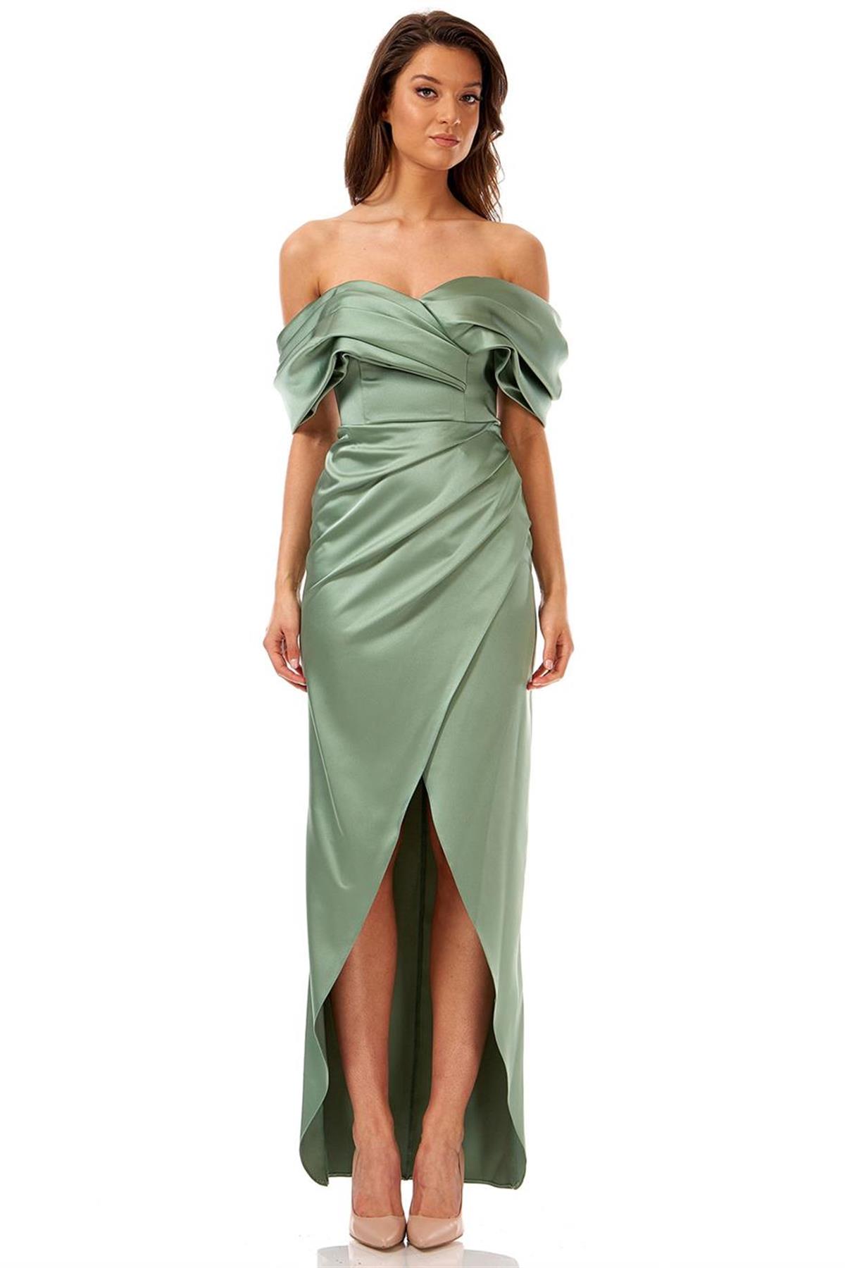 Düşük Kol Kayık Yaka Yırtmaçlı Saten Uzun Abiye Elbise