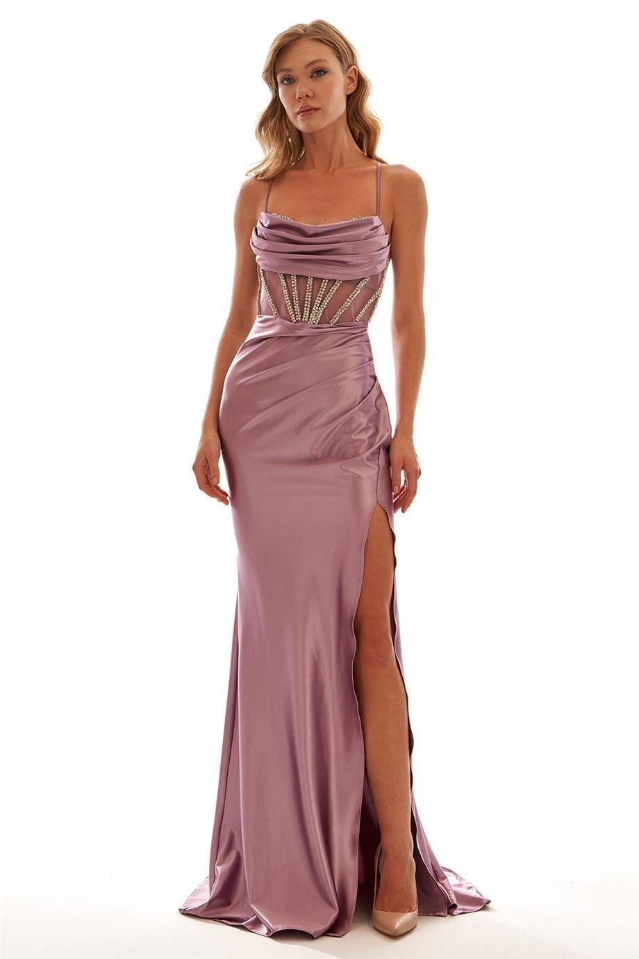 Transparan Tül Taş Detaylı Yırtmaçlı Saten Abiye Elbise