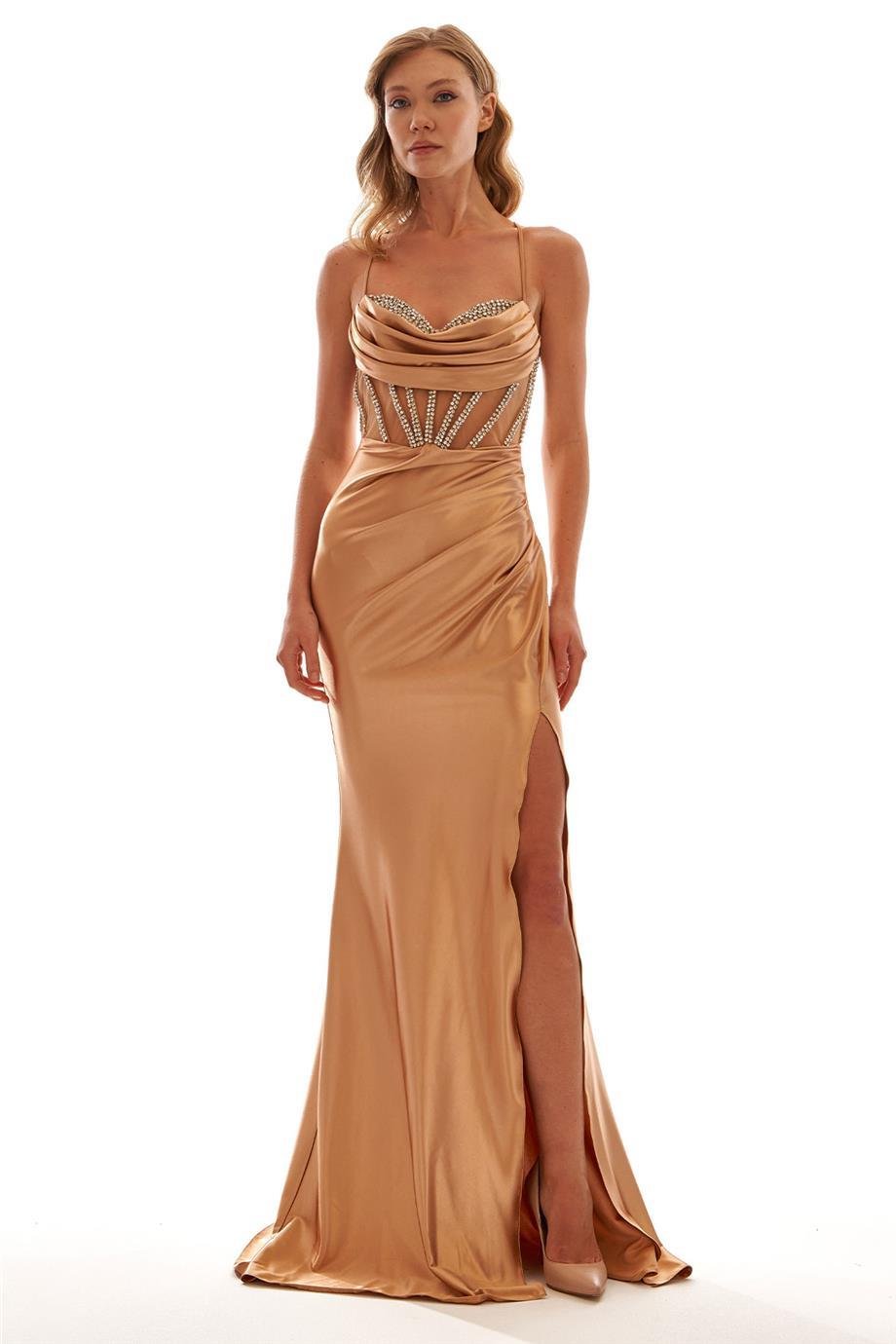 Transparan Tül Taş Detaylı Yırtmaçlı Saten Abiye Elbise