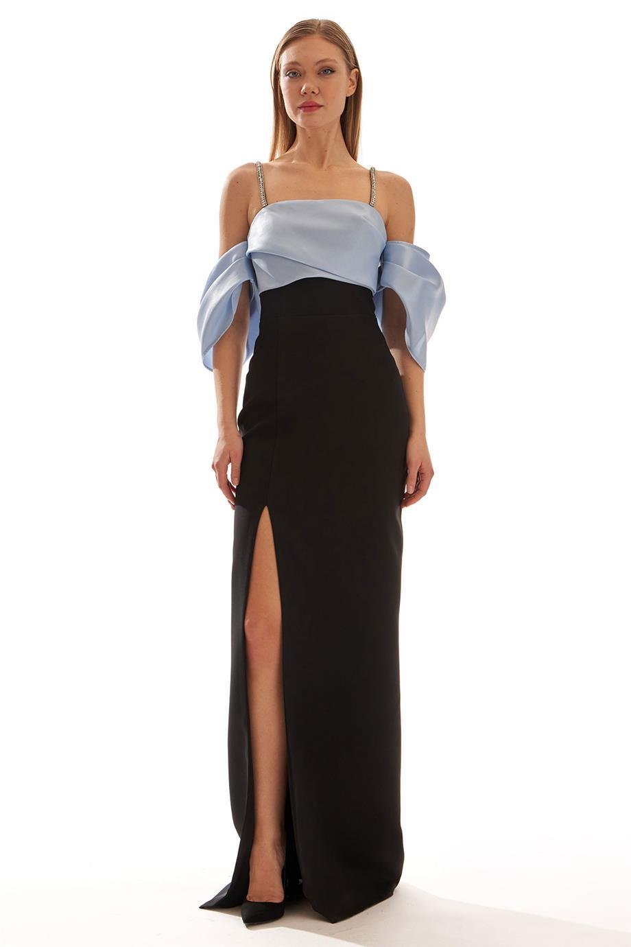 Düşük Kol Drapeli Taş Askılı Yırtmaçlı Kadın Abiye Elbise