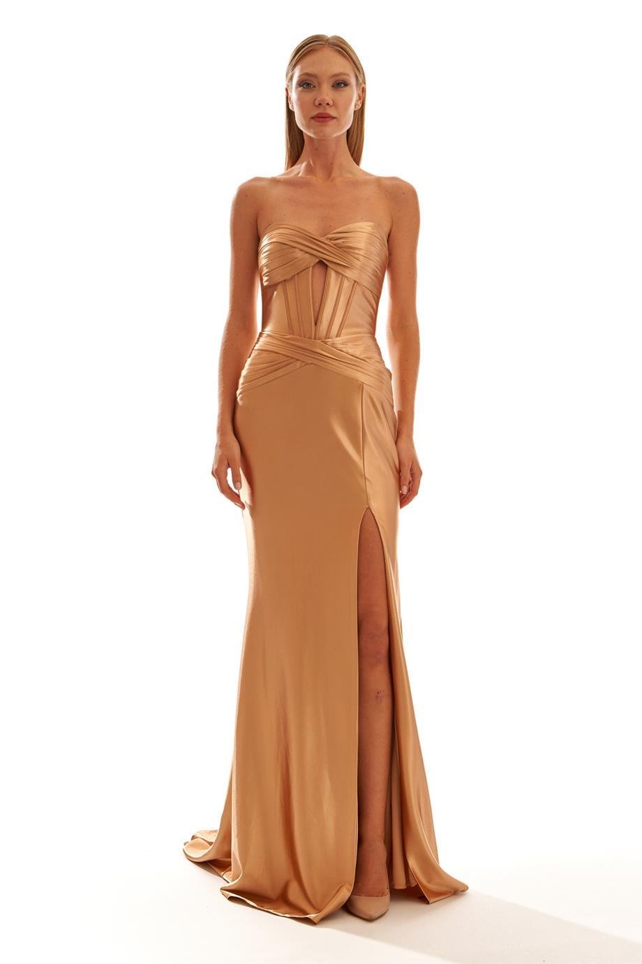 Straplez Yaka Dekolteli Saten Kadın Uzun Abiye Elbise