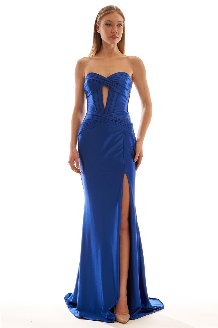 Straplez Yaka Dekolteli Saten Kadın Uzun Abiye Elbise