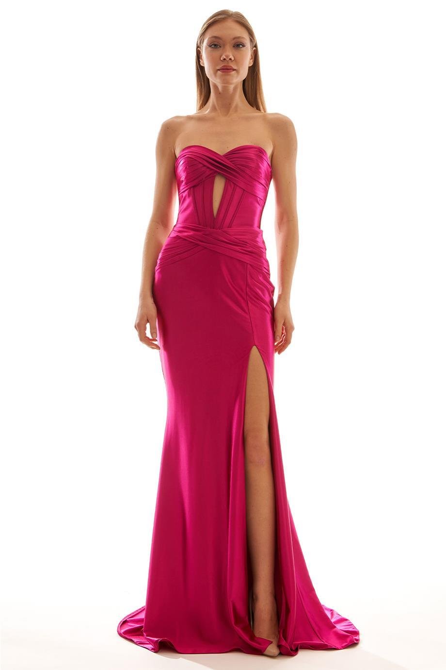 Straplez Yaka Dekolteli Saten Kadın Uzun Abiye Elbise