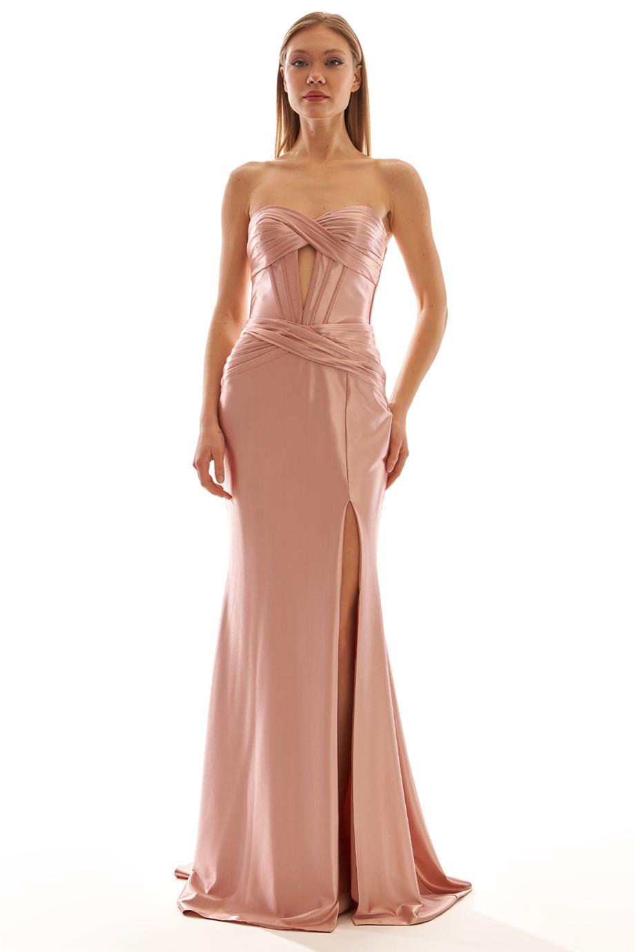 Straplez Yaka Dekolteli Saten Kadın Uzun Abiye Elbise