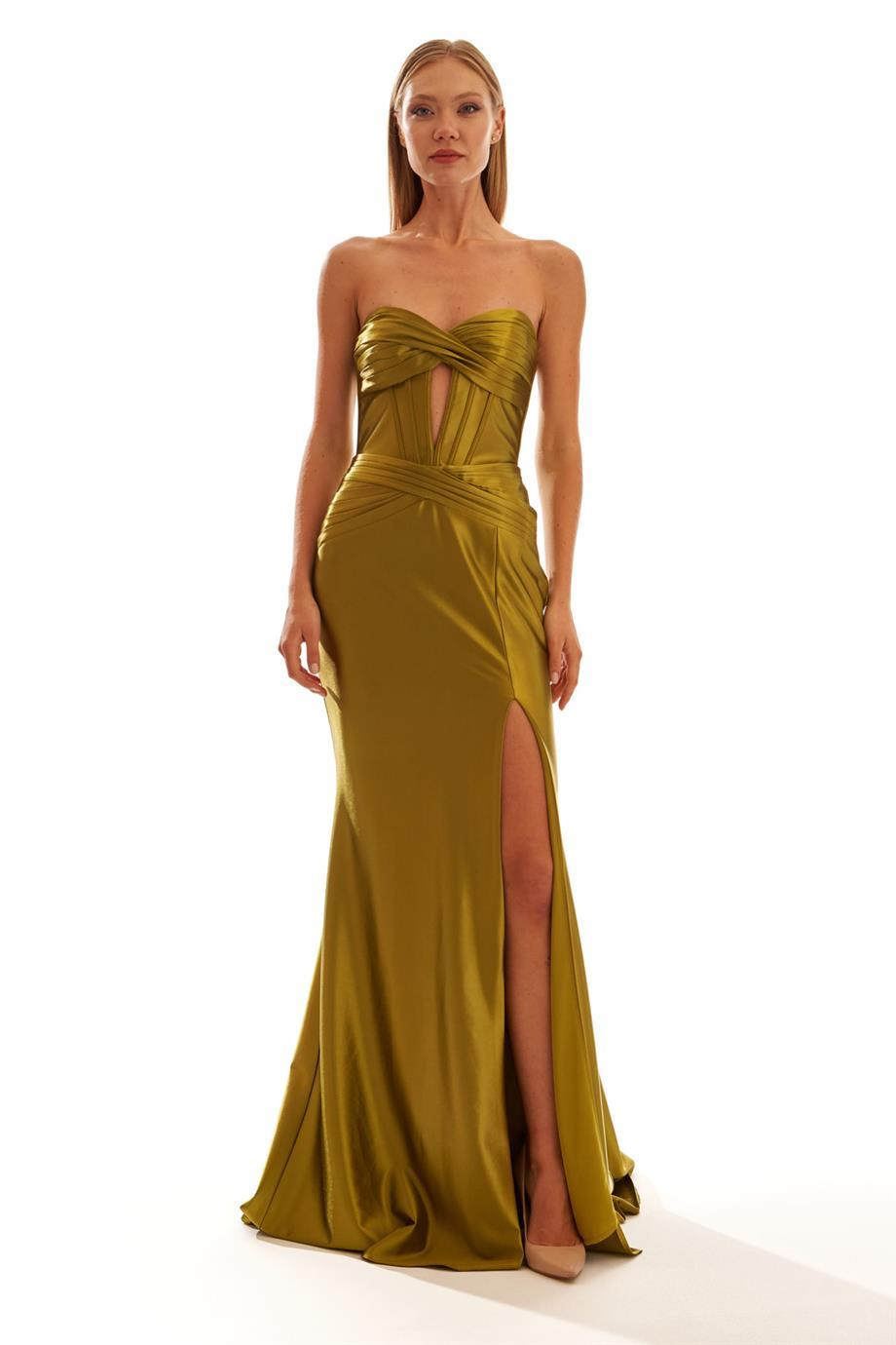 Straplez Yaka Dekolteli Saten Kadın Uzun Abiye Elbise