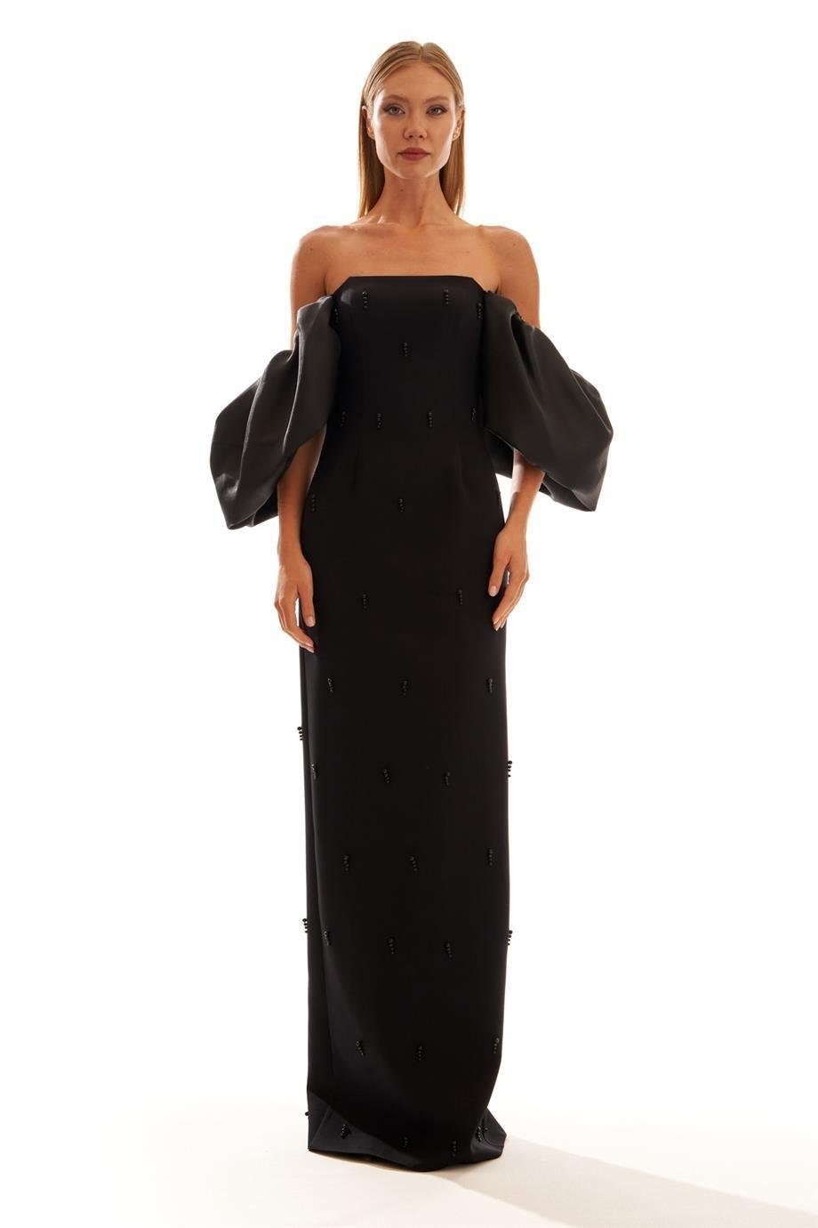 Straplez Omuz Dekolteli Arka Yırtmaçlı İnci Taş Detaylı Krep Kadın Uzun Abiye Elbise