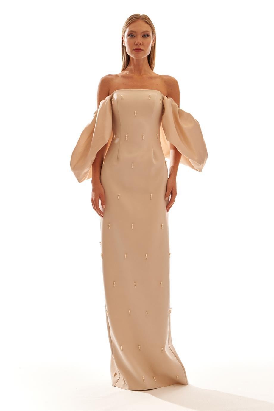 Straplez Omuz Dekolteli Arka Yırtmaçlı İnci Taş Detaylı Krep Kadın Uzun Abiye Elbise