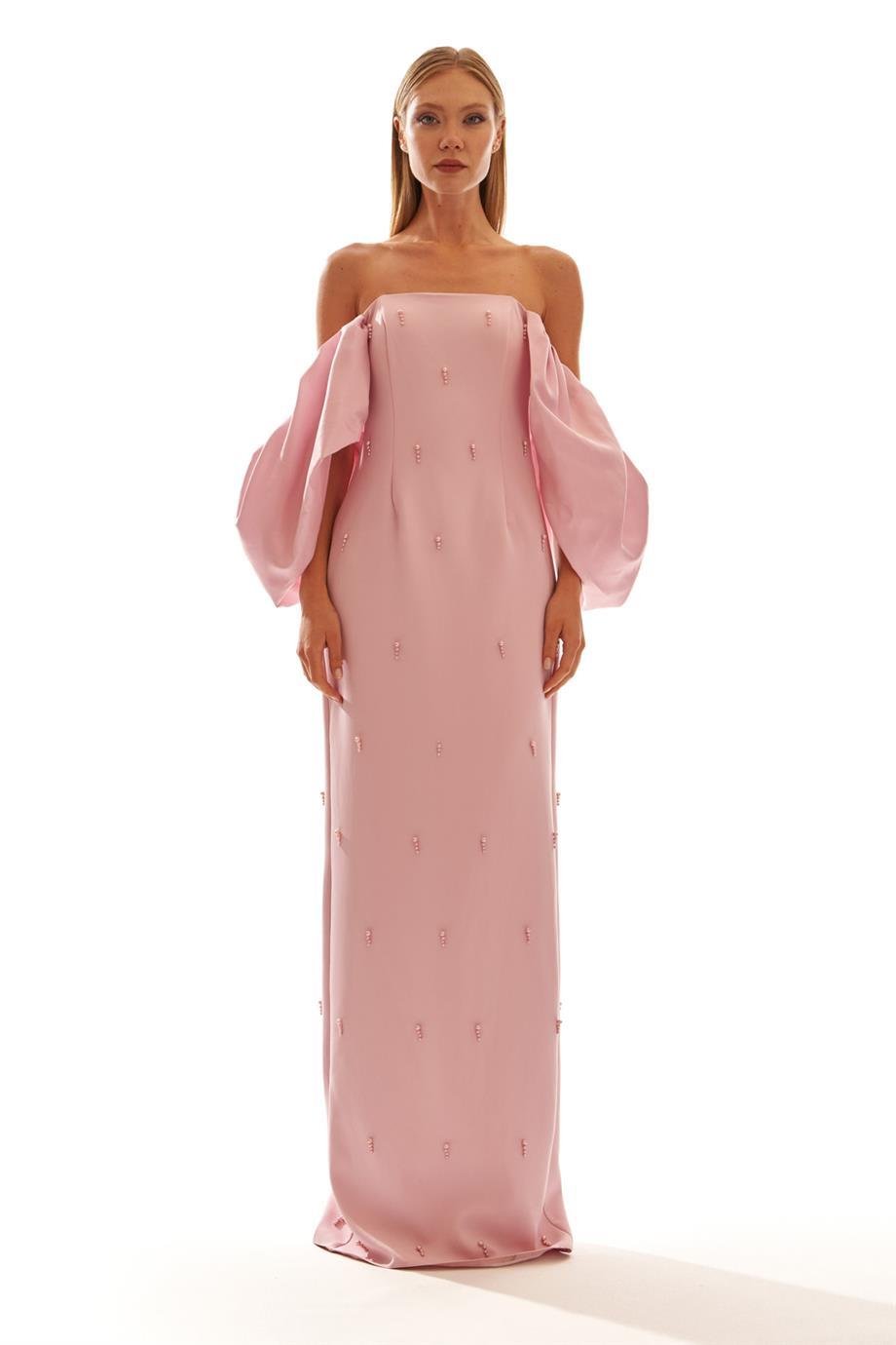 Straplez Omuz Dekolteli Arka Yırtmaçlı İnci Taş Detaylı Krep Kadın Uzun Abiye Elbise