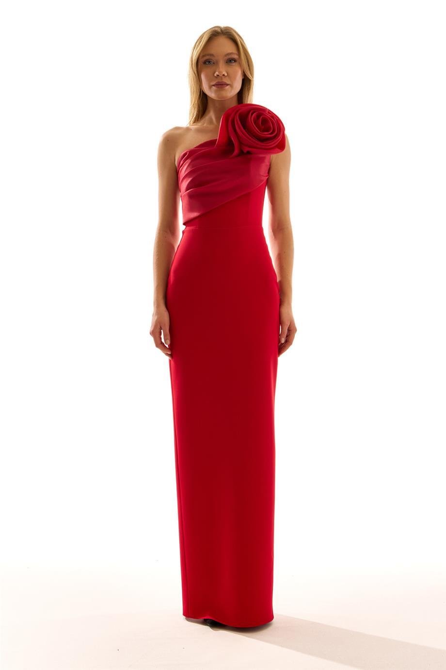 Tek Omuz Gül İşlemeli Yırtmaç Detaylı Kadın Uzun Abiye Elbise