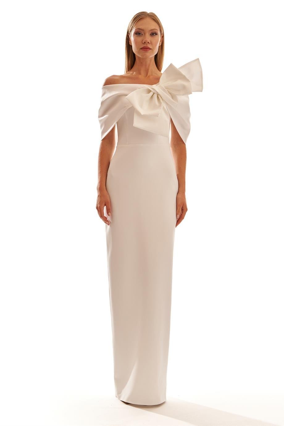 Straplez Yaka Düşük Kol Yırtmaçlı Krep Uzun Kadın Abiye Elbise