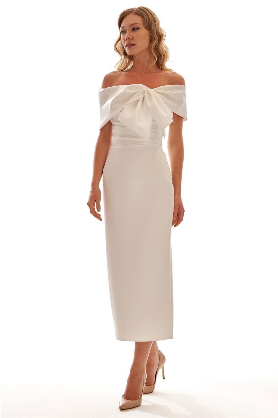 Straplez Fiyonklu Omuz Açık Kadın Midi Abiye Elbise