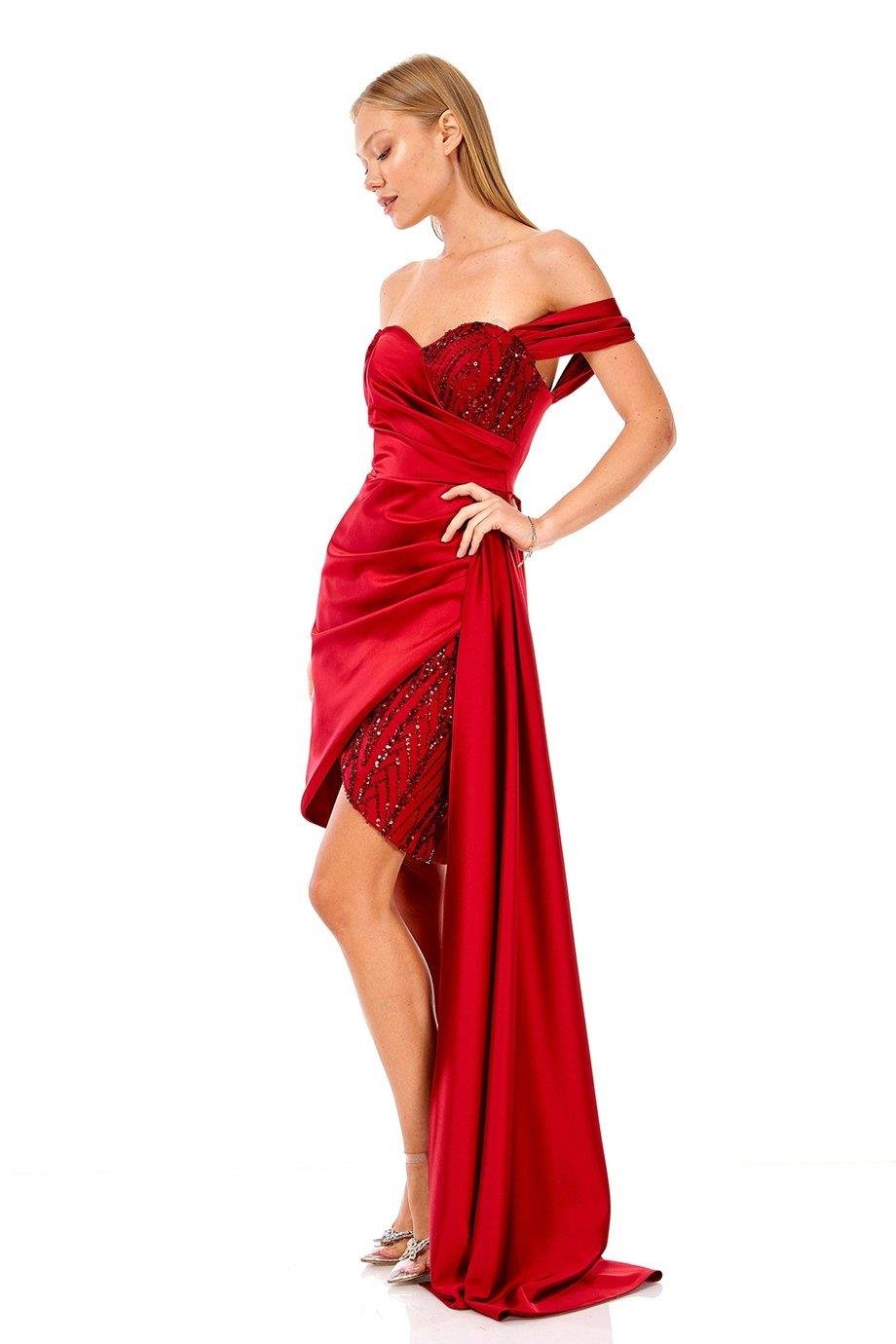 Düşük Kol Kayık Yaka Yırtmaçlı Saten Uzun Abiye Elbise