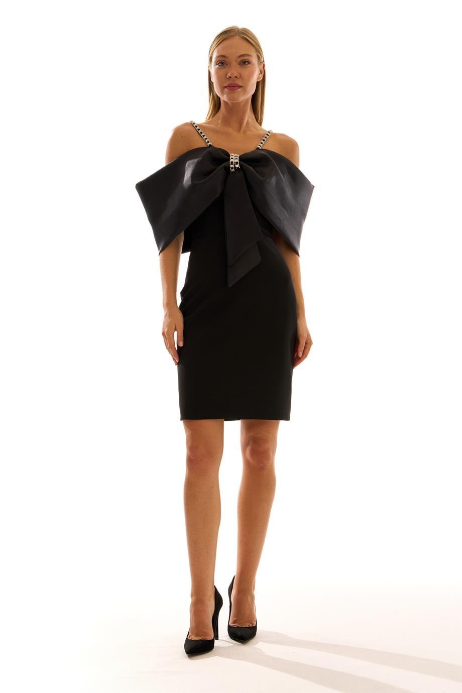 Düşük Kol Askıtaş Işlemeli Krep Kumaş Kısa Abiye Elbise