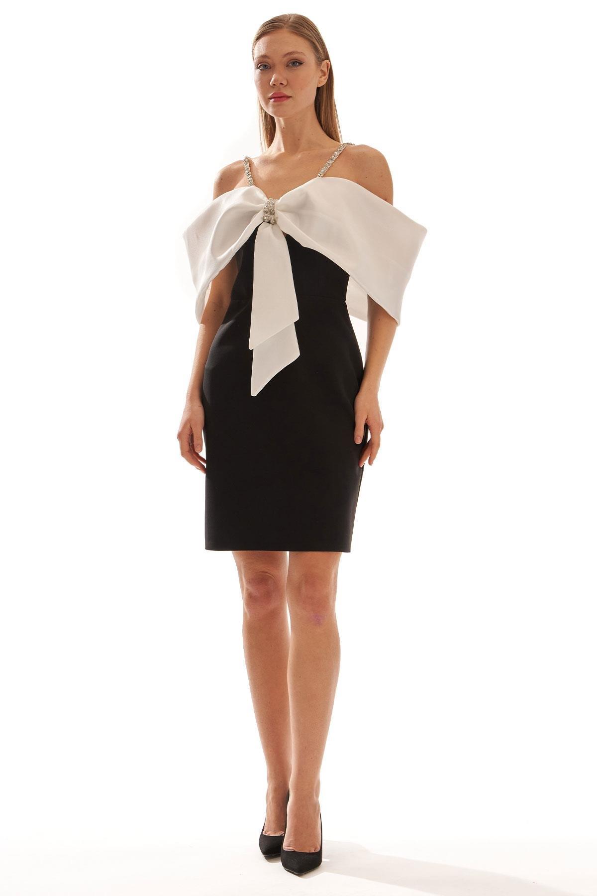 Düşük Kol Askıtaş Işlemeli Krep Kumaş Kısa Abiye Elbise